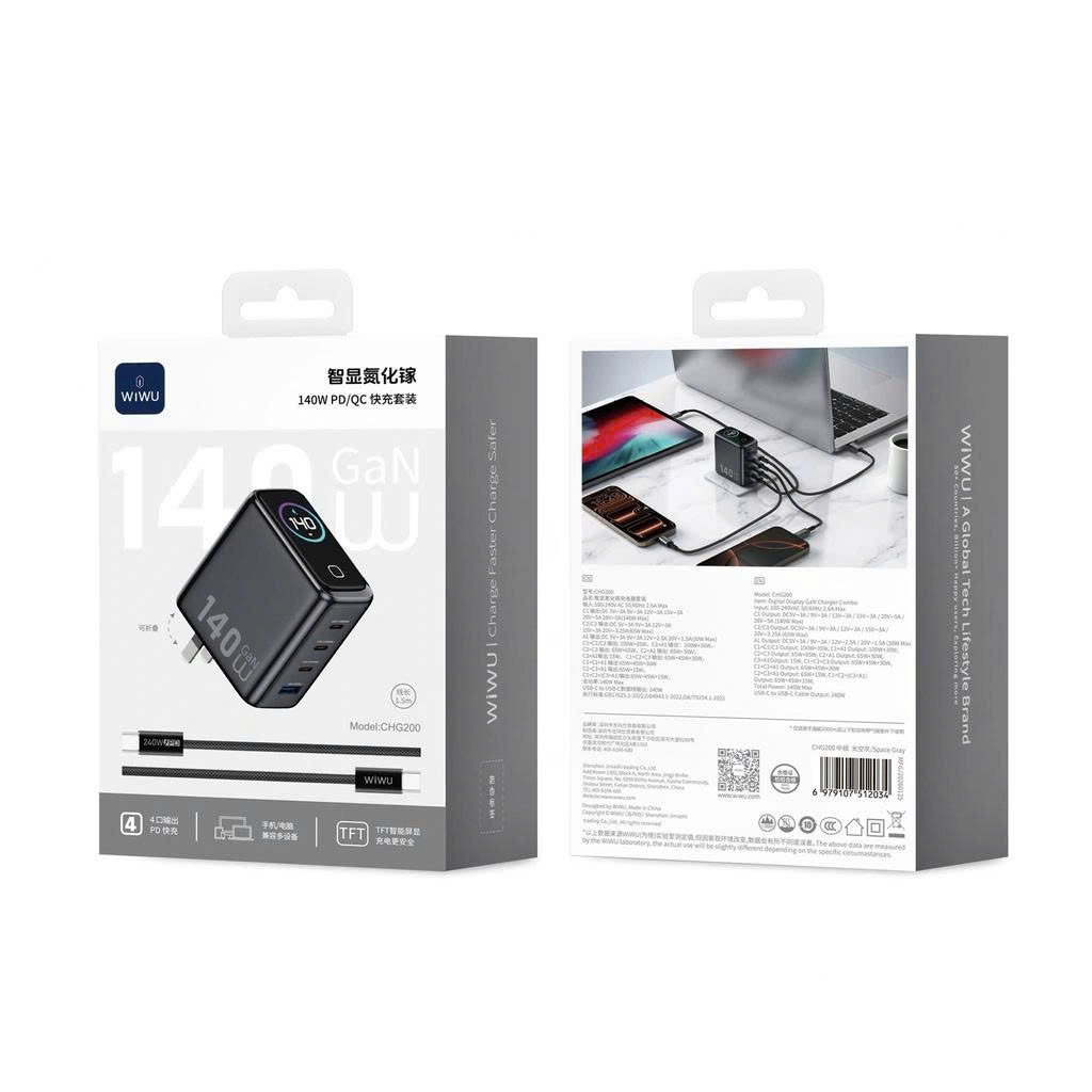 Combo Bộ sạc GaN WiWU Voyager 140W PD/QC CHG200 là bộ sạc nhanh cao cấp sử dụng CÔNG NGHỆ GaN HIỆN ĐẠI, mang lại CÔNG SUẤT MẠNH MẼ LÊN ĐẾN 140W trong thiết kế nhỏ gọn. Vỏ sạc được làm từ VẬT LIỆU CHỐNG CHÁY PC (V0) kết hợp chân cắm đồng bền bỉ, giúp CHỊU NHIỆT TỐT – CHỐNG VA ĐẬP HIỆU QUẢ.