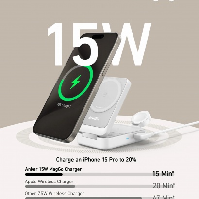 Anker MagGo 3-in-1 (B2557) – Trạm sạc không dây đa năng chuẩn Qi2, sạc nhanh 15W cho iPhone, kèm sạc Apple Watch và AirPods tiện lợi. Thiết kế gập siêu mỏng, dễ mang theo, đế dựng điều chỉnh góc linh hoạt. Tích hợp công nghệ GaN và ActiveShield™ – sạc nhanh, mát, an toàn mọi lúc, mọi nơi. Lý tưởng cho dân công nghệ yêu sự gọn gàng.