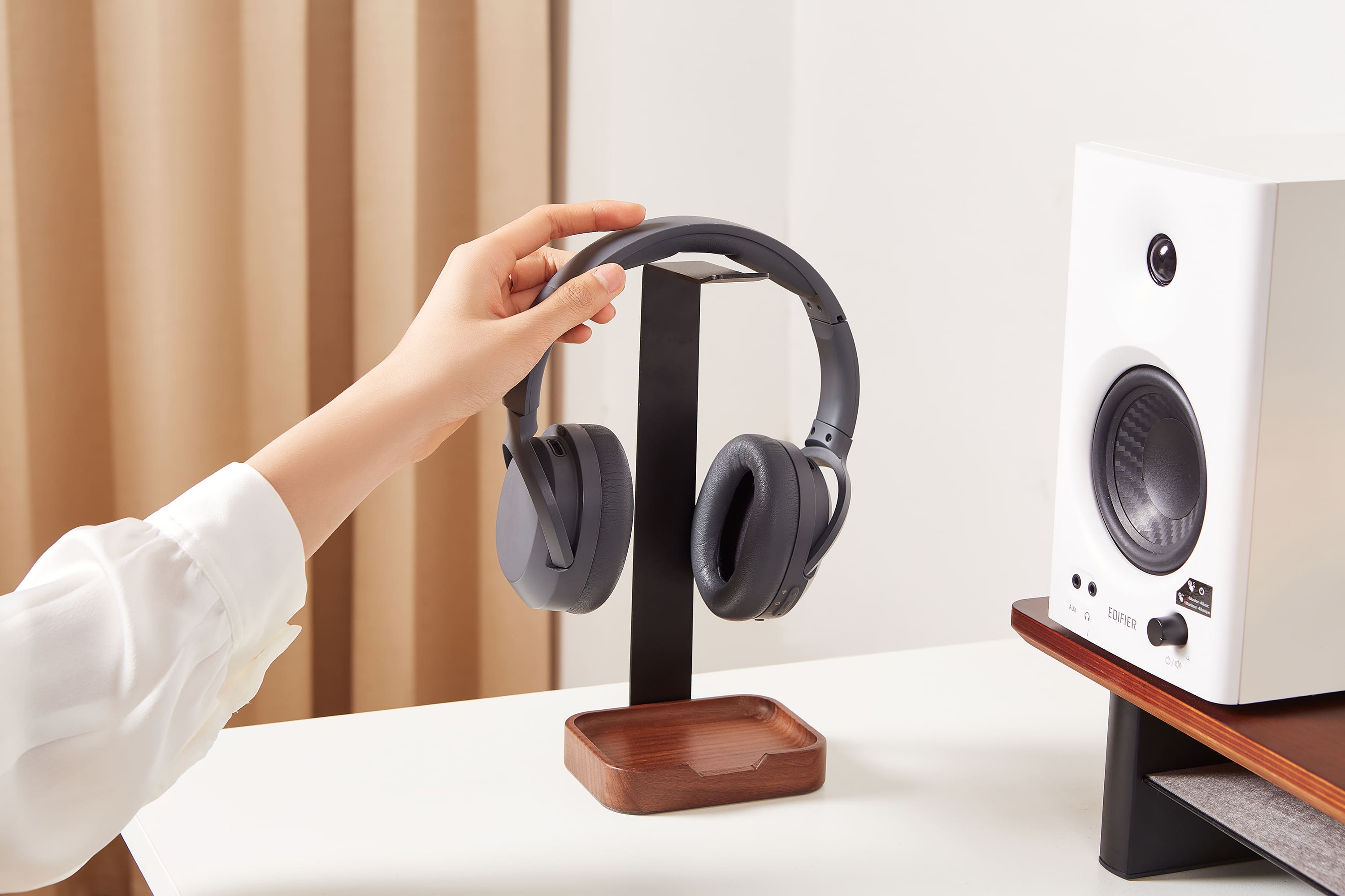 Giá đỡ tai nghe HyperWork HS01 được chế tác từ gỗ óc chó và nhôm cao cấp, mang đến sự bền bỉ và vẻ đẹp tinh tế. Thiết kế gọn gàng giúp bảo vệ tai nghe, đồng thời tạo điểm nhấn sang trọng cho không gian làm việc.