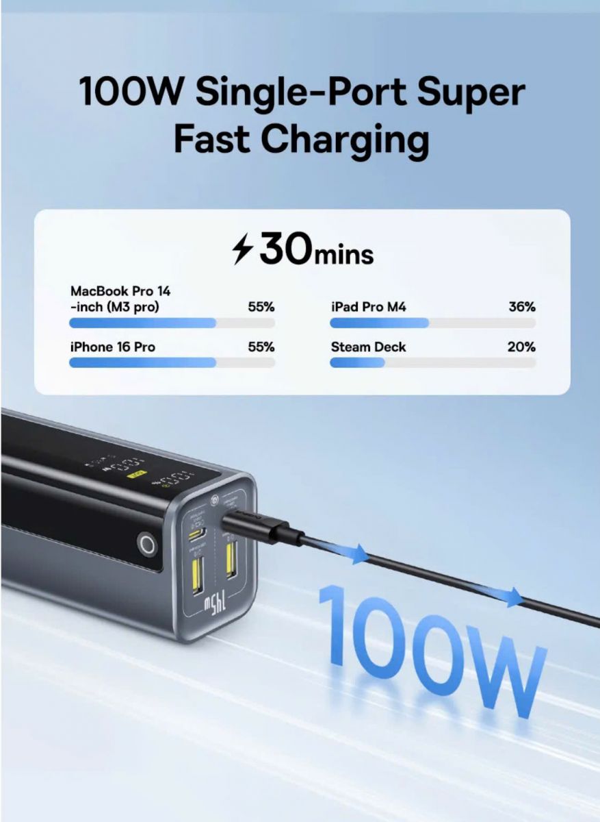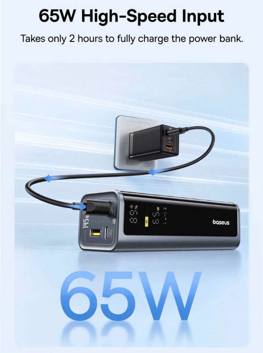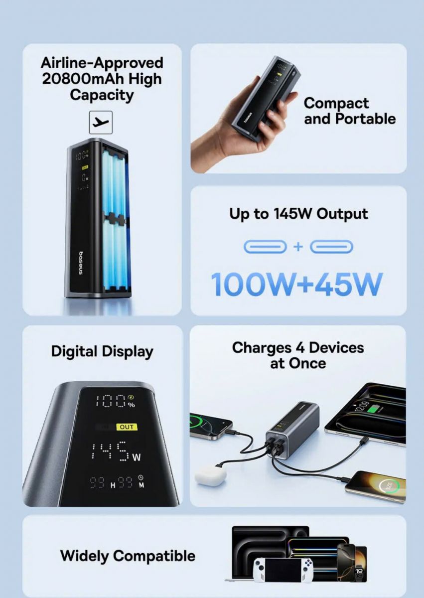 Pin Dự Phòng Baseus 20800mAh 145W sở hữu dung lượng lớn được phép mang lên máy bay, cùng công suất sạc siêu nhanh 145W (100W + 45W) giúp sạc đồng thời 4 thiết bị như laptop, điện thoại hay tablet chỉ trong thời gian ngắn. Màn hình kỹ thuật số thông minh hiển thị rõ dung lượng và công suất sạc, trong khi thiết kế nhỏ gọn, tương thích rộng rãi với nhiều thiết bị, mang đến giải pháp sạc di động mạnh mẽ, tiện lợi và an toàn cho mọi chuyến đi.