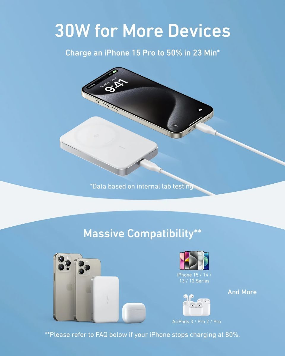 Anker MagGo Slim 10000 hỗ trợ sạc không dây với công suất lên đến 15W, đạt chứng nhận Qi2, cho phép sạc nhanh các thiết bị tương thích. Theo thông tin từ nhà sản xuất, thiết bị có thể sạc iPhone 15 Pro từ 0% đến 50% chỉ trong 51 phút. Tính năng này đặc biệt hữu ích cho những người sử dụng iPhone từ dòng 12 trở lên đã cập nhật lên iOS 17.4.