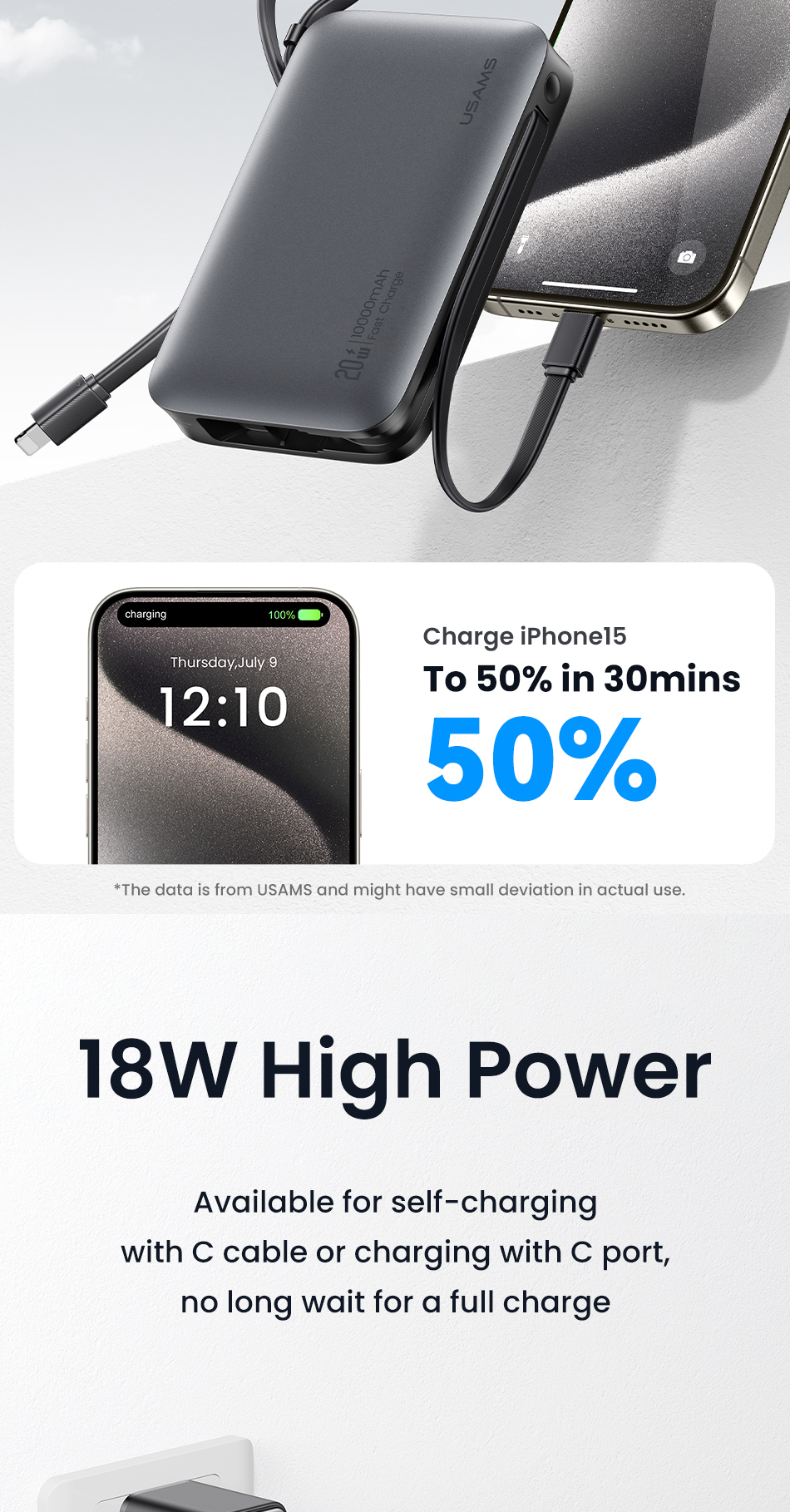 Pin dự phòng USAMS CD228 10000mAh – sạc nhanh 20W, nhỏ gọn, tiện lợi mang theo sạc mọi lúc mọi nơi.