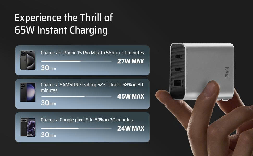 ⚡ Củ sạc nhanh Cuktech GaN 65W mang đến hiệu năng mạnh mẽ trong thiết kế nhỏ gọn và sang trọng. Với công suất tối đa 65W, sản phẩm dễ dàng sạc nhanh laptop, điện thoại, tablet chỉ trong thời gian ngắn. Trang bị 3 cổng (2 USB-C + 1 USB-A) cùng công nghệ GaN tiên tiến, giúp tản nhiệt tốt, tiết kiệm năng lượng và đảm bảo an toàn cho mọi thiết bị.