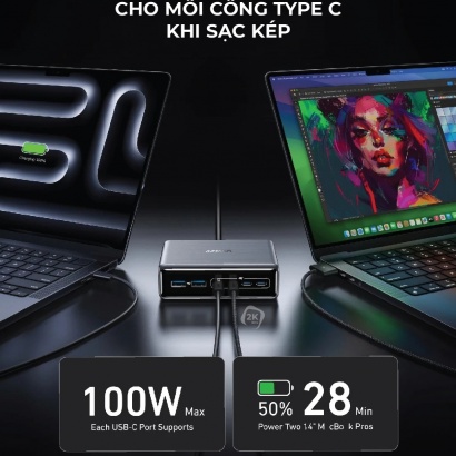 Nhờ hỗ trợ sạc nhanh công suất lớn (lên đến 100W mỗi cổng), bạn có thể nạp đầy pin cho hai chiếc MacBook Pro hoặc các dòng laptop khác cùng lúc một cách dễ dàng và tiết kiệm thời gian.